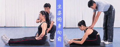 坐姿俯身向前。针对脊柱和大腿后侧肌肉的练习。重复3组,每组5~10次。动作:坐正,双腿向前平伸,脊柱保持自然,肩部放松。呼气时以髋关节为轴,上身向前屈,不要将脊椎弯曲成C形。感觉双腿后侧肌肉的拉伸。保持30秒,然后再呼气,上身逐渐接近双腿,每隔10秒贴近一些。吸气,逐渐恢复到正坐的姿势。求屈体到贴近双腿。只要你能感觉到双腿后面的肌肉有伸拉感即可。