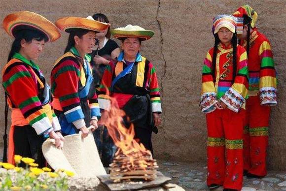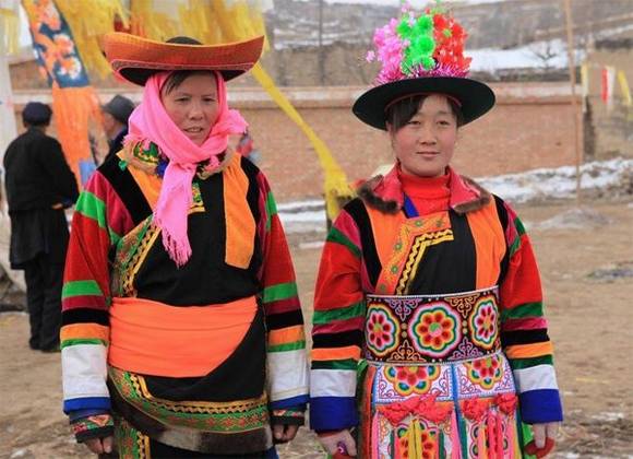 外穿小领大襟开叉长袍,袖子用红、黄、绿、白、黑五色布横拼而成(红色象征太阳,黄色象征五谷,绿色象征草木,白色象征奶汁,黑色象征土地。未婚姑娘和老年妇女不穿“花袖袖”),腰系两头绣有花草鸟蝶和云彩图案的彩色“达博”带。长袍外套一件黑色或紫色的斜大襟坎肩,其小襟上缀着绣花兜。下着黑、蓝色的宽腰裤、膝下套着类似裤腿的“贴弯”(未婚者着红色“贴弯”,已婚者着黑色“贴弯”),在“贴弯”靠膝盖的一头沿二指宽的一条白边,靠脚踝处沿一条蓝边。有的在长袍下穿一条弼红色褶裙(裙褶为双数),足穿简长一尺三寸的花鞋,鞋后缀一块称为“叶弯”的红布。
