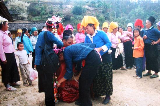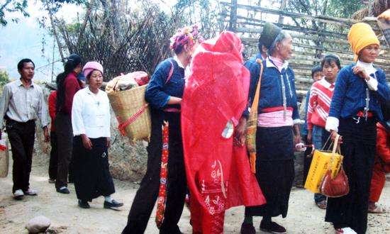 下午,男方的媒人领着八至十个老人和两个姑娘挑着礼品送彩礼来了。送进彩礼,摆席吃饭,姑娘们乘新郎不注意时给新郎抹黑脸,逗得大家哄堂而笑。姑娘们笑弯了腰,说:“大家记不得新姐夫,脸黑掉一半的就是!”要转回家时,新郎跪倒在岳父、岳母跟前说:“我要回去了!”二老就说几句吉利话,岳母给姑爷一匹自己织的布,岳父给姑爷五十元钱。这时调皮的姑娘冷不防把一串猪骨头挂在新郎肩上说:“肉我们吃光了,剩下的骨头、皮子请你带回去!”又引起一阵大笑。出了寨子,新郎才把骨头甩掉。