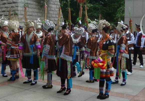 苗族主要聚居于贵州省东南部、广西大苗山、海南岛及贵州、湖南、湖北、四川、云南、广西等省区的交界地带。在中国古代典籍中,早就有关于五千多年前苗族先民的记载,这就是从黄河流域直到长江中游以南被称为“南蛮”的氏族和部落。苗族有自己的语言,苗语分三大方言:湘西、黔东和川黔滇。1956年后,设计了拉丁字母形式的文字方案。由于苗族与汉族长期交往,有很大一部分苗族兼通汉语并用汉文。