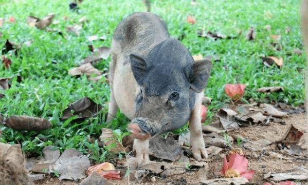 海南五脚猪,又称为香猪,这是一种将海南本地的小种母猪在发情期放到山中寻找野猪配种,然后生下来的小型猪。