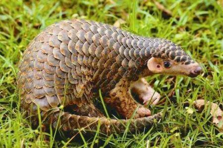 在遇到天敌时,穿山甲会缩成球一动不动。