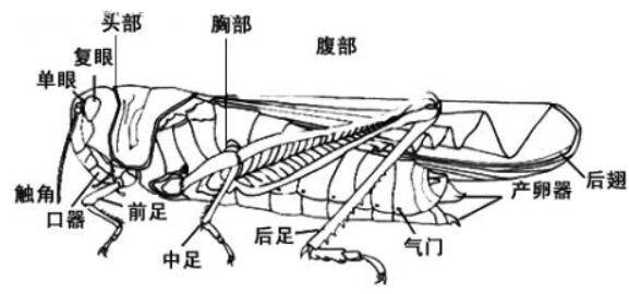蝗虫头部有触角、眼、口器,它的触角有触觉和嗅觉的作用。蝗虫的复眼由很多小眼组成,是主要的视觉器官,单眼只可以感光,而口器是蝗虫的取食器官。