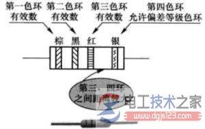 有关电阻标称值四环电阻色环的标示方法,电子电路中的电阻色标法,四环电阻标注示意图,4个色点的电阻示意图,四环电阻中色环的具体含义解读示意图,供大家参考。