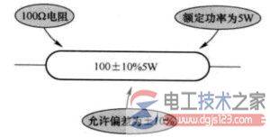 图一是电阻参数直标法示意图。直标法主要用在体积较大(功率大)的电阻上,它将标称阻值和允许偏差直接用数字标在电阻上。