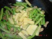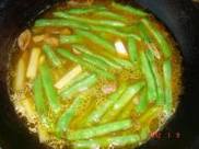 将豆角放锅中炒几分钟,使豆角边成翠绿色。