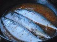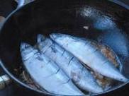 5.开大火,放入鲐鲅鱼。