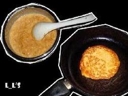 4、用大勺舀出调好的面糊放入锅内,待一面烙出锅巴后翻面,用锅铲稍按压有锅巴的一面,使饼的表面平整;