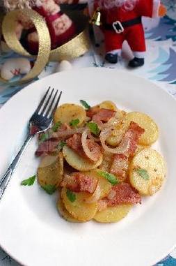 4.锅中放洋葱煸炒片刻,再加土豆煸炒,至洋葱身软,土豆外表金黄黄时加少许盐和胡椒粉,放入培根炒匀出锅装盘,撒芹菜叶OK.