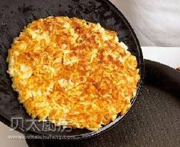 中火加热不粘锅中的橄榄油,待烧热后将土豆丝放入锅中翻炒5分钟,然后用木铲将土豆丝整理成圆饼的形状,再转小火慢慢煎制10分钟。