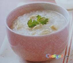 2、鸡胸肉洗净切丁,拌入调味料(1)略腌,待粥煮滚时加入同煮至熟软,再加入盐和胡椒粉后熄火盛出,食用时加入香菜少许即可。