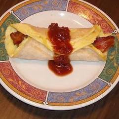 2.将玉米饼摊在整个蛋上,当蛋变硬并与玉米饼沾在一起后,翻一面让培根在上面。在培根上倒上辣酱然后卷起来。起锅切成小块,趁热吃即可。