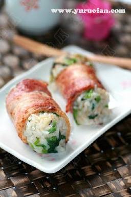 5、取一条培根放在饭团中间裹起来,然后放入不粘锅内小火煎5分钟即可