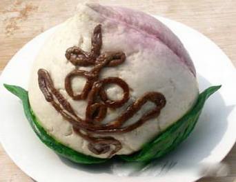 2、另取少许面团加入菜汁和咖啡粉揉匀,分别做成绿色和棕色的面团,绿色的面做成叶子,粘在馒头上,棕色的面揉成条,做成寿字粘在桃身上,将做好的寿桃上笼屉蒸20分钟左右即可。